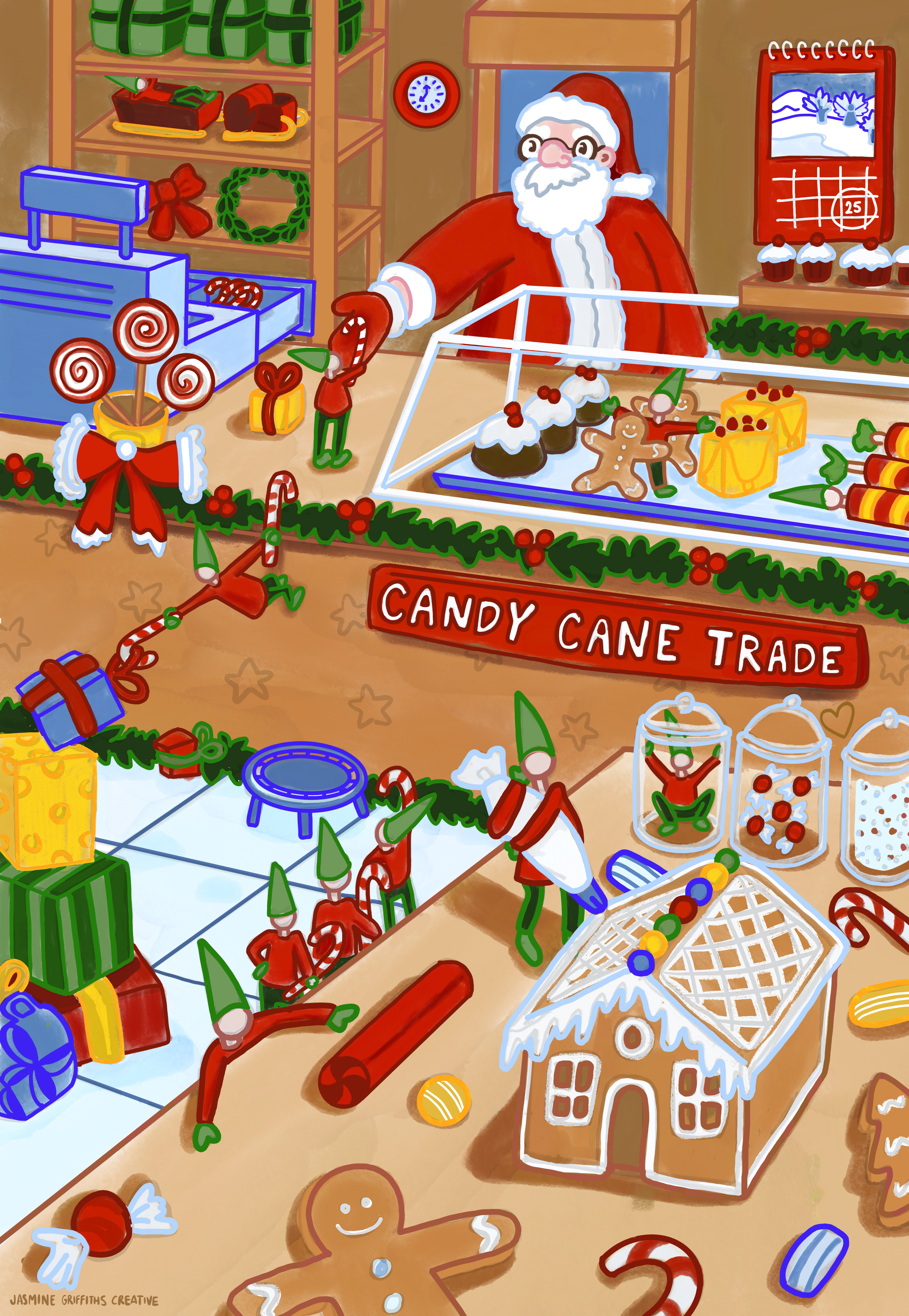 The elves have been busy at the gift wrapping station and need a well deserved lunch break. The little workers are lining up to trade their hard earned candy canes for tasty treats and little gifts that they’ve had their eyes on for a while.