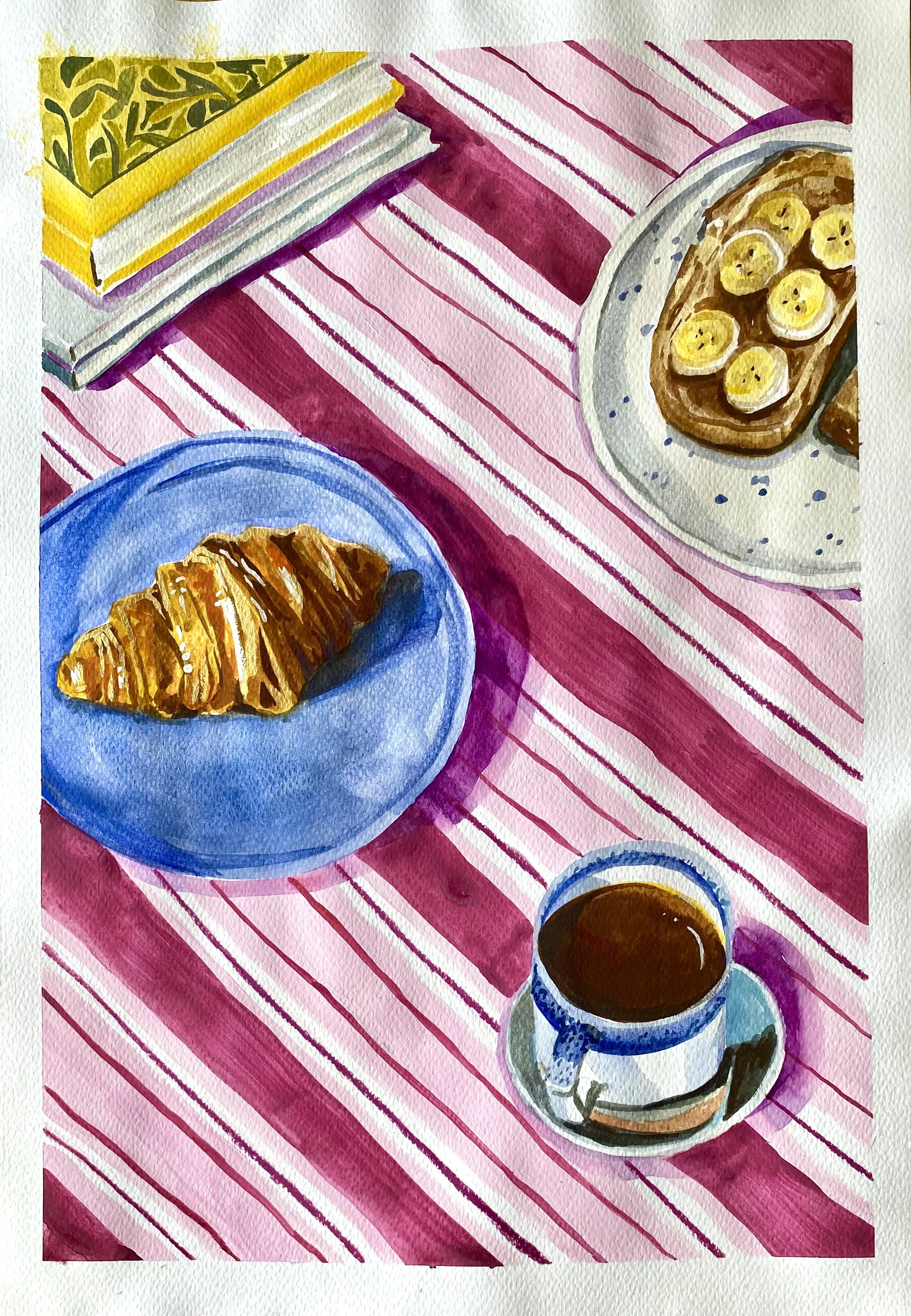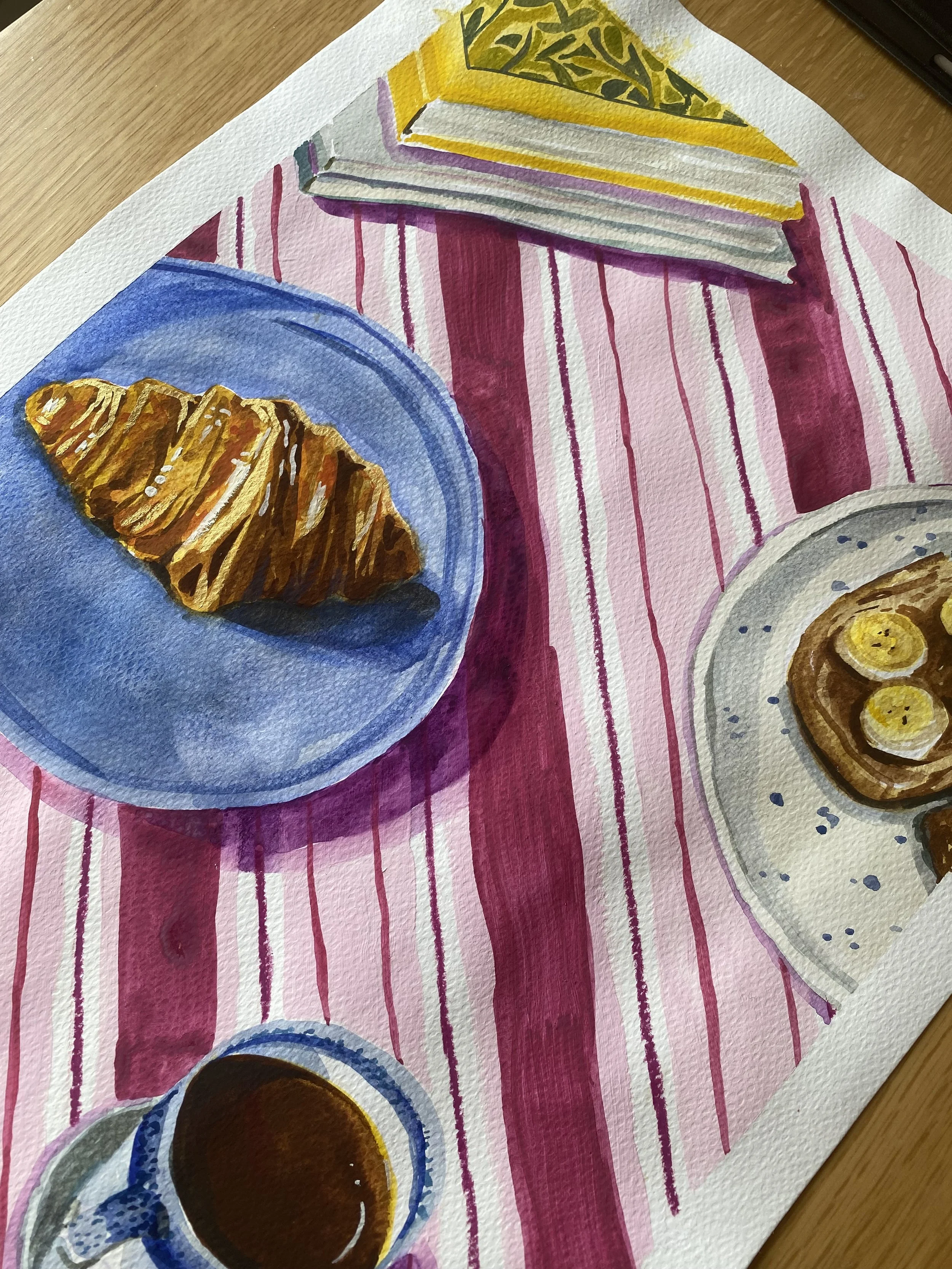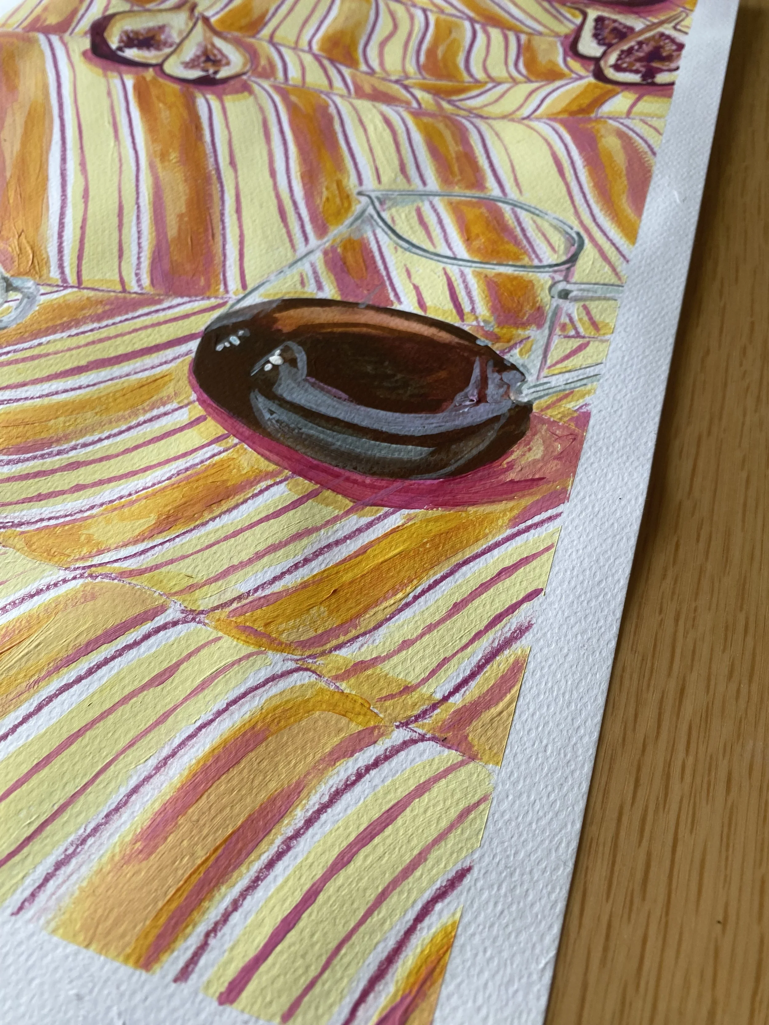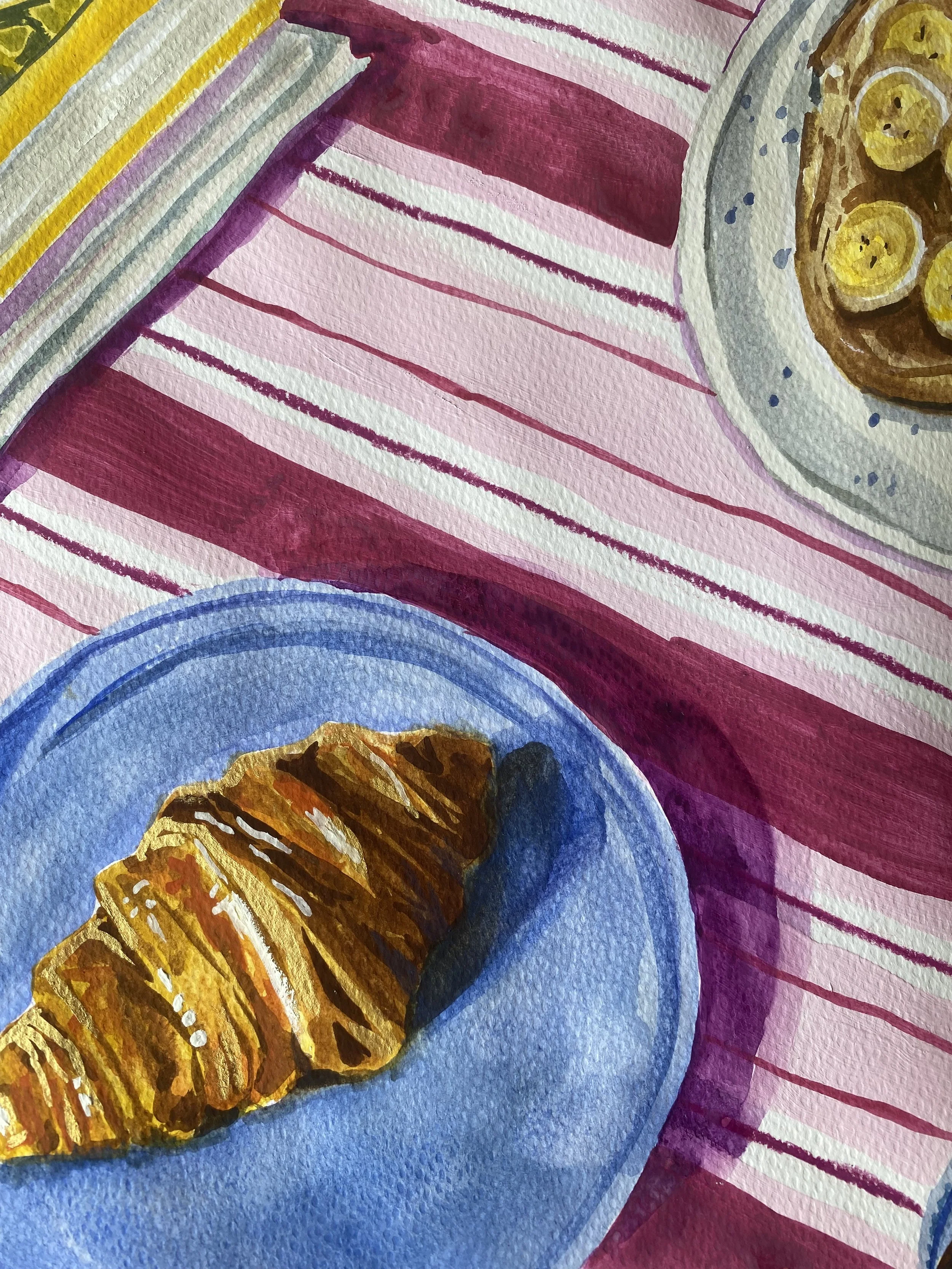 This original painting is part of my ‘Summer Brunch’ series which features various food combinations on top of bright, patterned tablecloths. This series was inspired by the food photography of Lauren Rea, an Australian food influencer.