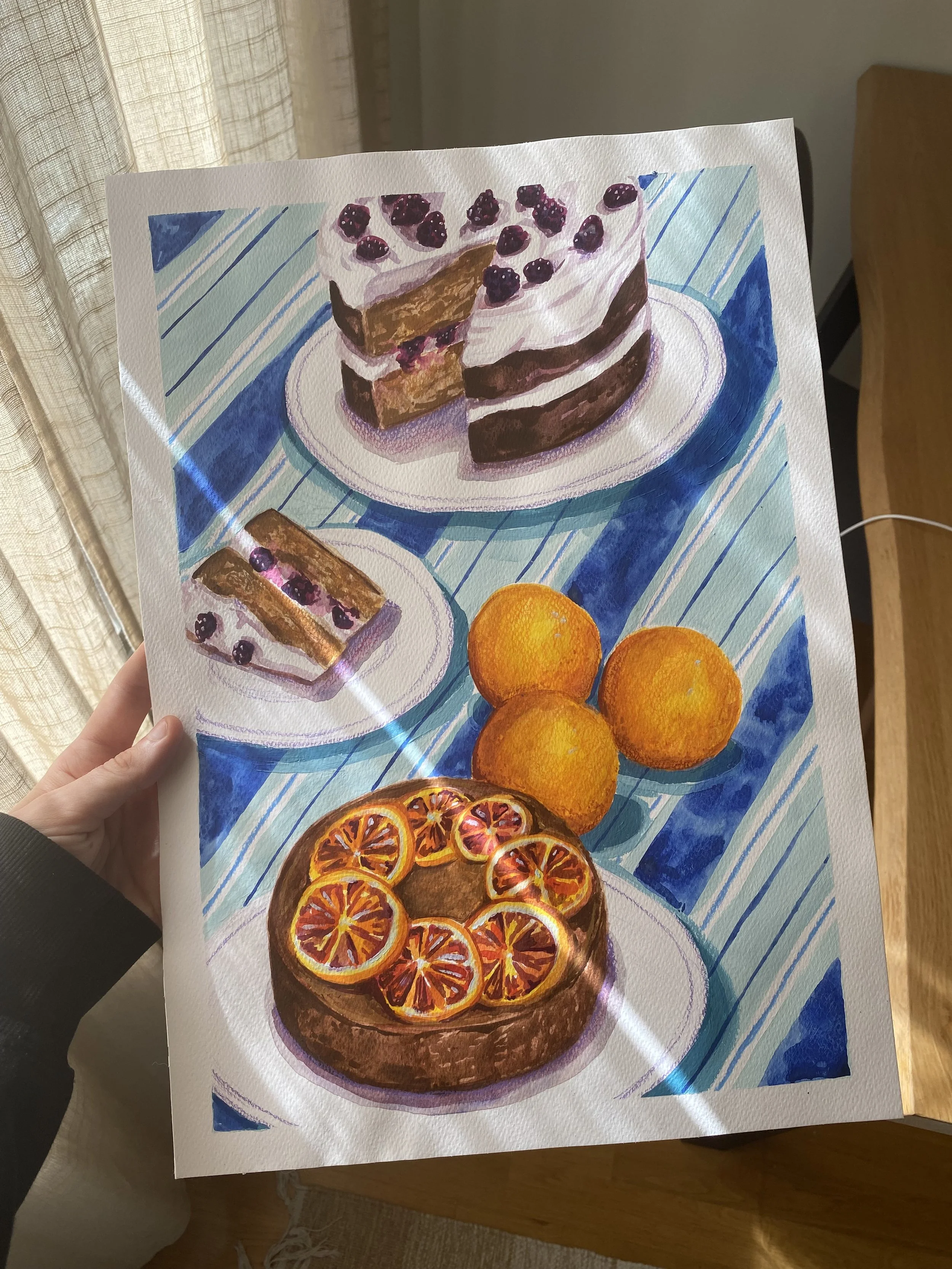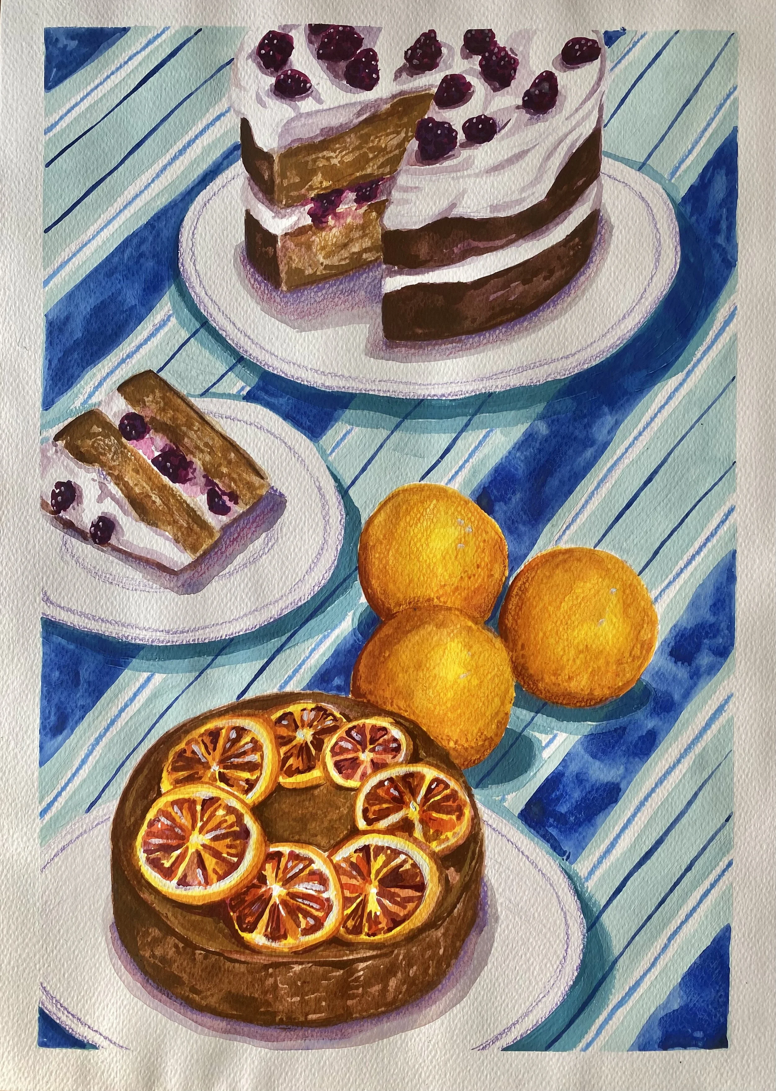I was drawn to the vibrant colours, reflections and texture and wanted to try and capture the feeling of having a tasty brunch with friends on a warm summer morning.